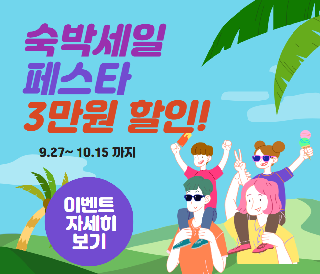 전국 어느 지역에서든 5만 원을 초과한 숙박예약을 하면 3만 원을 할인받을 수 있는 쿠폰이 제공되는 것입니다. 숙박 세일 페스타는 10월 27일에 다시 2차로 30여 만장이 배포될 예정이니, 10월 여행 계획이 있는 분들도 참고하시면 좋을 듯합니다.