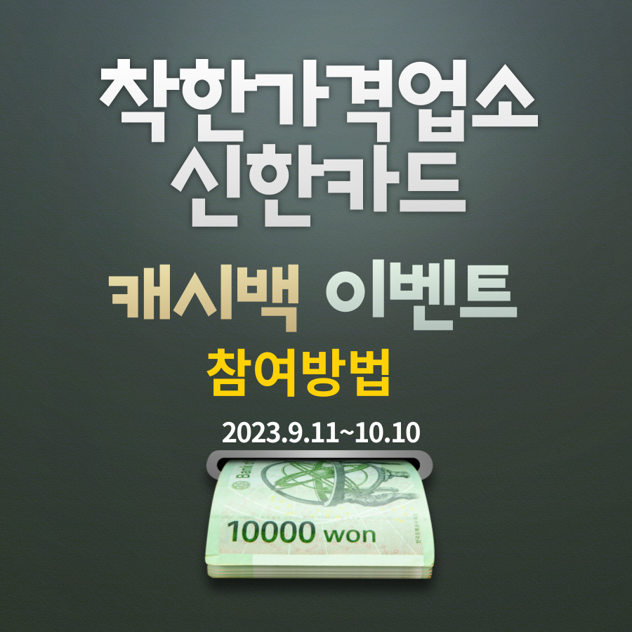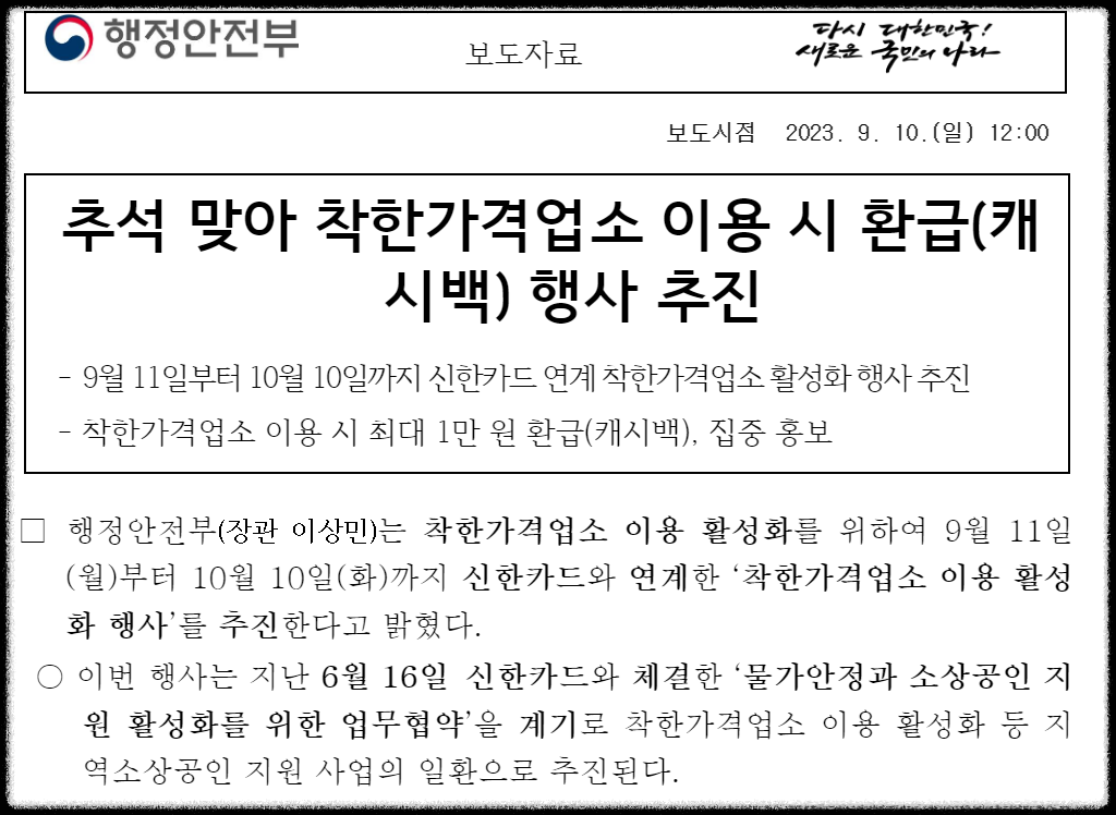 추석을 맞아 행정안전부와 신한카드가 협약을 맺어 소비자가 착한가격업소 이용 시 최대 1만 원을 환급(캐시백)해주는 행사를 진행 중입니다.