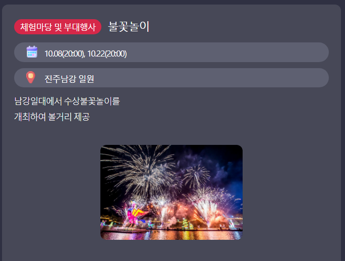 23.10.8(일)과 10.22(일 ) 양일에 걸쳐 저녁 8시에 진주 남강 일원에서 펼쳐집니다. 멋진 불꽃놀이가 예상되니 꼭 참석해 보시기 바랍니다.