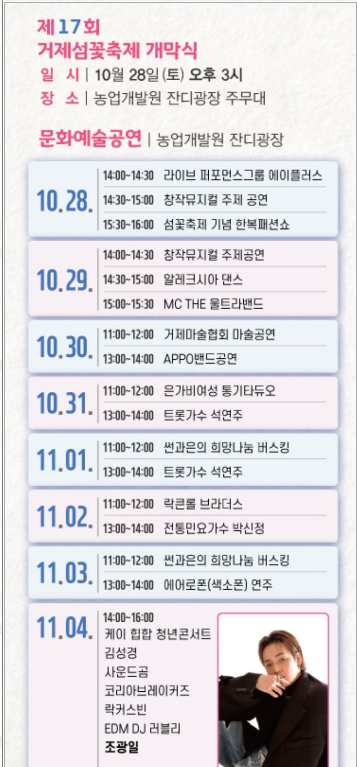 국화꽃을 메인으로 하는 거제 섬꽃 축제가 올해로 벌써 17회째를 맞게 되었습니다. 각종 공연과 체험관, 문화전시, 꽃 테마파크등 더욱 새로워진 축제로 자녀들과 함께 방문하면 정말 좋은 곳이라서 추천드립니다.
