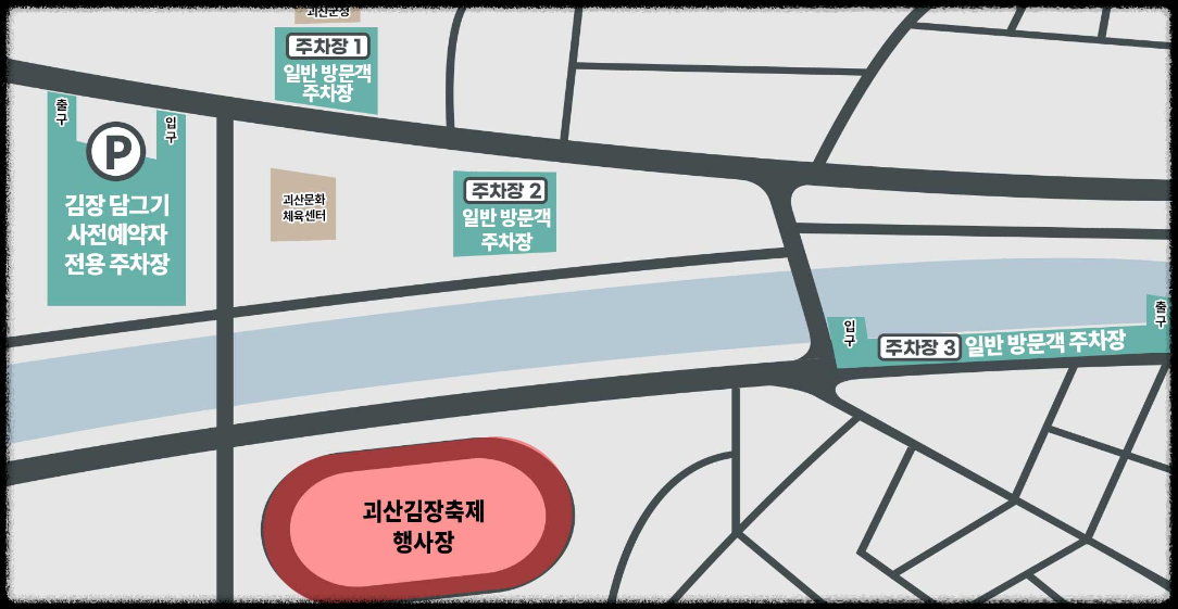 김장 사전예약자는 다목적운동장을 이용하시고(괴산읍 서부리 661) 그 외 일반 방문객은 괴산군청과 유기농 엑스포광장,동진천 하상 주차장등을 이용하시면 됩니다.