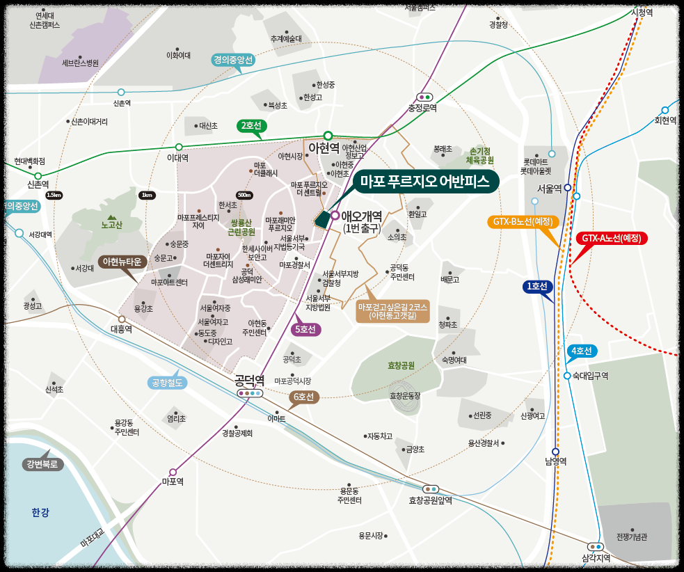 애오개역 앞에 위치하는 초역세권 아파트입니다. 주변에 대단지아파트가 이미 여럿 있어 생활 인프라가 자리 잡혀 있습니다. 대형마트도 인근에 있어 편리합니다. 도보 10분이면 서울 2호선 아현역에 닿을 수 있고 5호선인 애오개역이 초근접인 더블 역세권입니다. 여의도역, 광화문역등이 모두 가까이 있으며 강남 출퇴근이 편리합니다. 주변에 초중고가 인접해 있어 학교 다니기에도 좋습니다.
