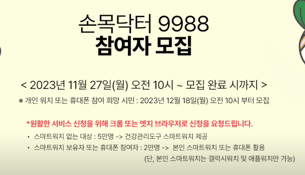 23.11.27(월) 오전 10시 ~ 모집 완료 시까지 선착순 모집이며 검색창에서 손목닥터 9988 검색 후 홈페이지에서 회원가입 하신 후 진행하시면 됩니다.