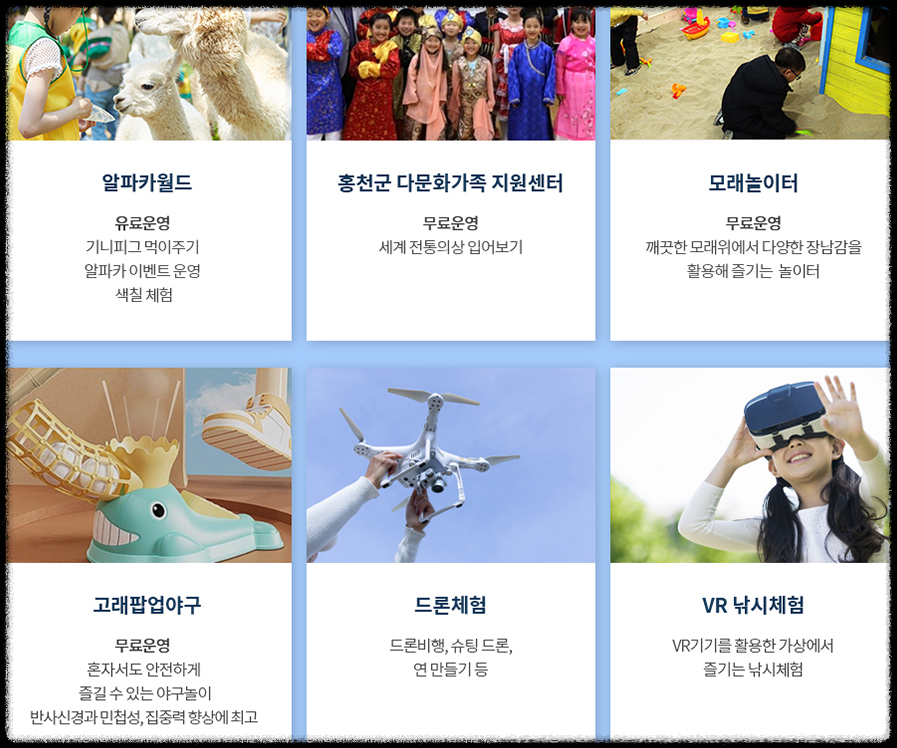 VR 낚시체험, 고래 팝업야구, 알파카월드, 모래놀이터등 체험할 수 있는 여러 프로그램이 있습니다. 무료와 유료로 나뉘어 있습니다.