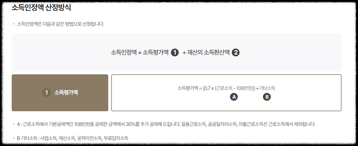 월소득 인정액이란 본인이 가지고 있는 재산을 월 소득으로 환산한 금액을 모두 합한 금액을 말합니다. 근로소득에서 108만 원을 공제하고, 남은 금액에서 또 30%를 공제합니다. 공제되는 부분이 많기 때문에 기초노령연금에 해당이 되는 경우가 많습니다.