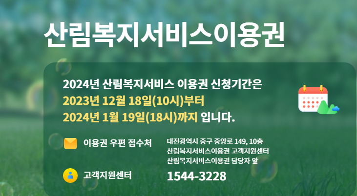 대전광역시 중구 중앙로 149,10층 산림복지서비스 이용권 고객지원센터 산림복지서비스이용권 담당자 앞으로 신청서 및 제출서류를 작성하여 등기로 발송합니다.