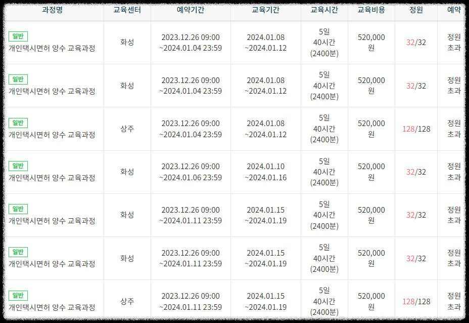 개인택시 양수교육은 당일 빠르게 마감이 되는 특징이 있으며, 마감이 되면 취소자가 나오길 기다려야 합니다.