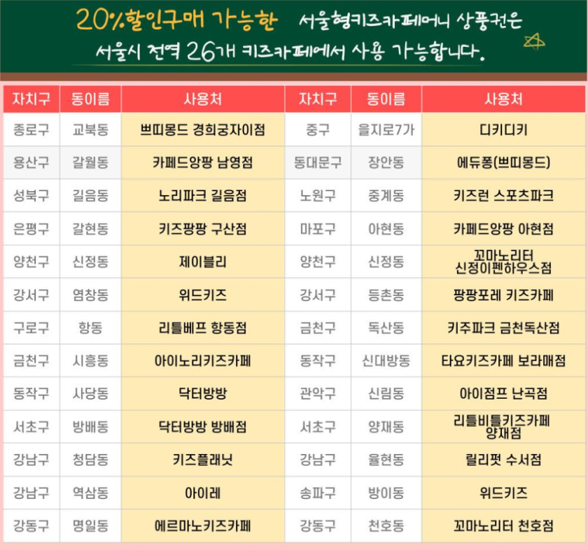 서울형 키즈카페머니는 20% 할인된 금액에 민간키즈카페를 사용할 수 있는 상품권입니다. 지금은 26개 키즈카페에서 사용할 수 있습니다.