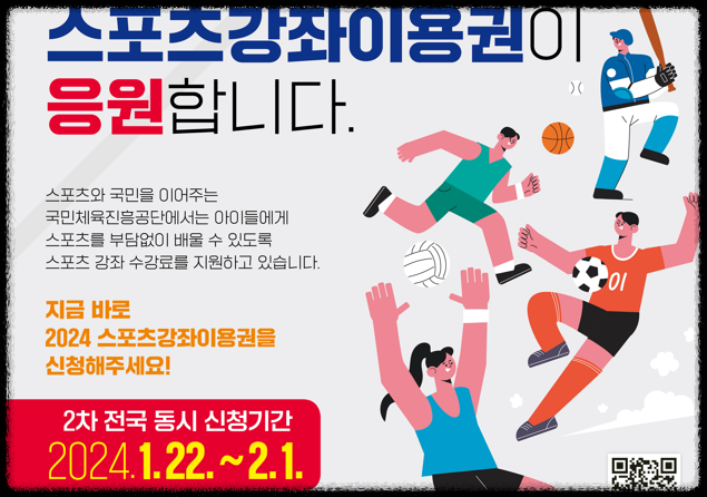 매월 10만 원을 지원받을 수 있는 스포츠강좌이용권 신청기간이 시작되었습니다. 지원대상과 지원내용 확인하셔서 해당되신다면 꼭 신청하고 혜택 받으시기 바랍니다.