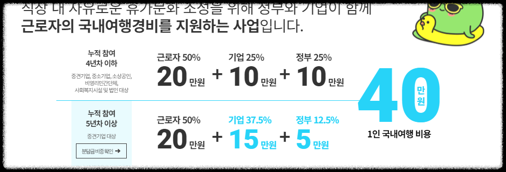 근로자에게 주어지는 휴가비 40만원 중 본인 부담은 50%인 20만 원, 기업이 10만 원, 정부가 10만 원을 출자합니다.