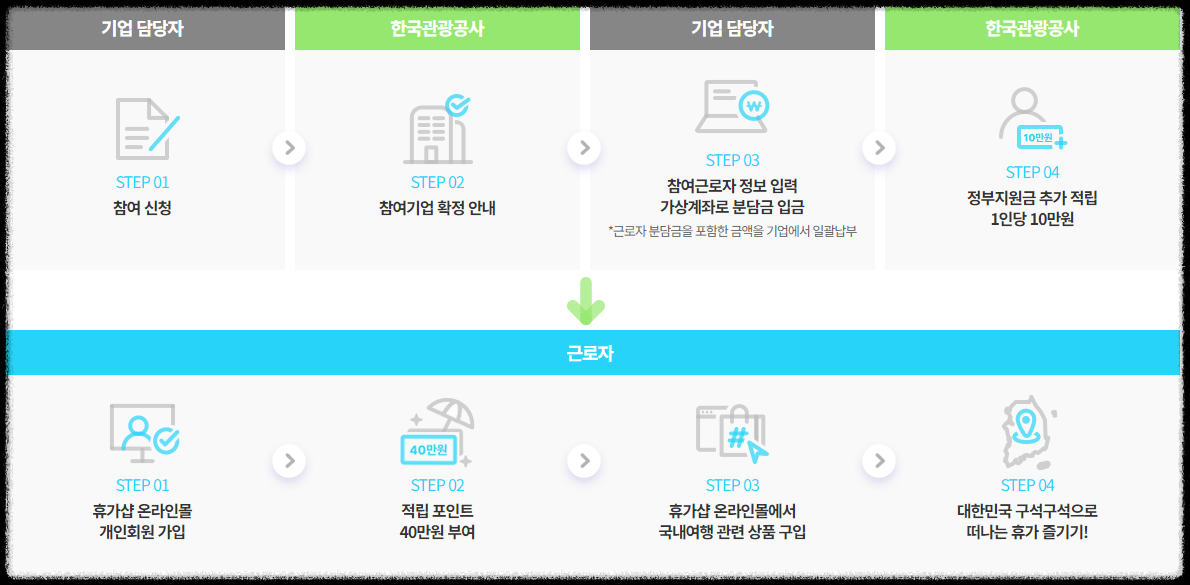 근로자휴가비지원사업 홈페이지 접속 - 기업 참여 신청 - 참여기업 확정 - 근로자,기업 정보 제출 - 기업과 근로자 분담금 입금 -정부지원금 적립 - 포인트 사용