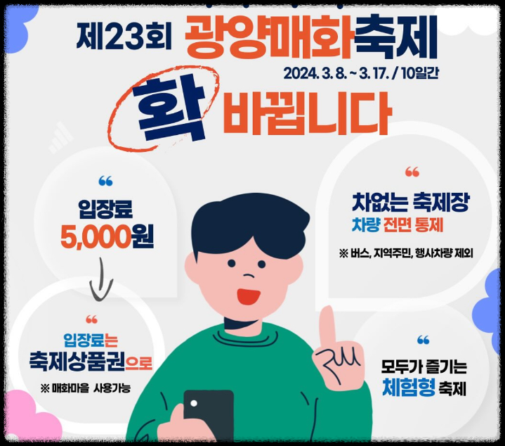 이상은 봄 꽃 축제 광양 매화축제 일정과 기본 정보에 대해 살펴보았습니다. 꿀팁까지 잘 확인하셔서 스트레스 없이 가족, 친구, 연인과 즐거운 시간 보내시기 바랍니다.