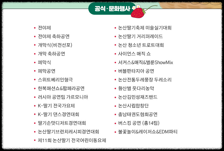 아래 글을 통해 2024 논산딸기축제 기본 일정과 주요 프로그램,주차 등의 정보 확인해 보시고 좋은 시간 보내시기 바랍니다.