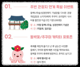 주변의 마량 동백나무숲, 성경전래지기념관을 방문한 관광객에게는 주꾸미 요리장터 식사 할인권을 지급해 드리는 이벤트입니다. (1인 기준 1,000원)