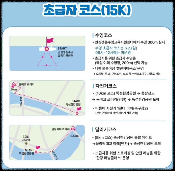 수영 : 300m와 1km 코스가 준비되어 있으며 13세 이하 어린이와 초보자는 초급자 수영존 한 바퀴(200m)만 돌면 완주로 인정합니다. 상급자는 잠실 수중보 남단 ~ 북단 1km 구간을 도하하는 코스입니다.