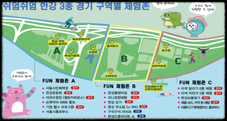 지금까지 누구나 도전할 수 있는 쉬엄쉬엄 한강3종경기 신청방법과 코스에 대해 알아보았습니다. 3종경기뿐 아니라 일반 시민들도 참여할 수 있는 다양한 프로그램이 있으니 참여하셔서 특별한 경험의 시간 가져보시기 바랍니다.