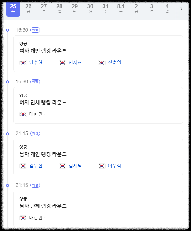 1. 양궁 : 7/25 ~ 8/4