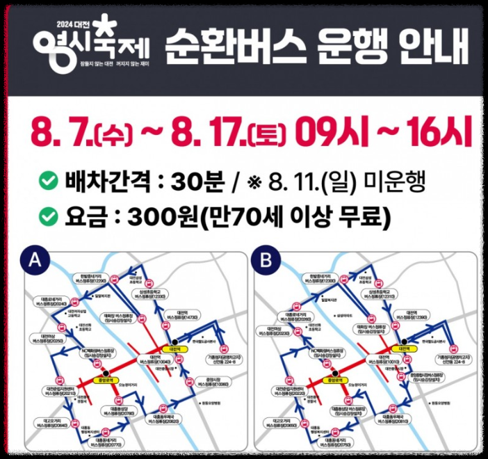 축제 기간 중 지하철을 연장, 증편하여 관람객들의 편의를 도모하며 순환버스도 운행중이니 많은 이용 바랍니다.