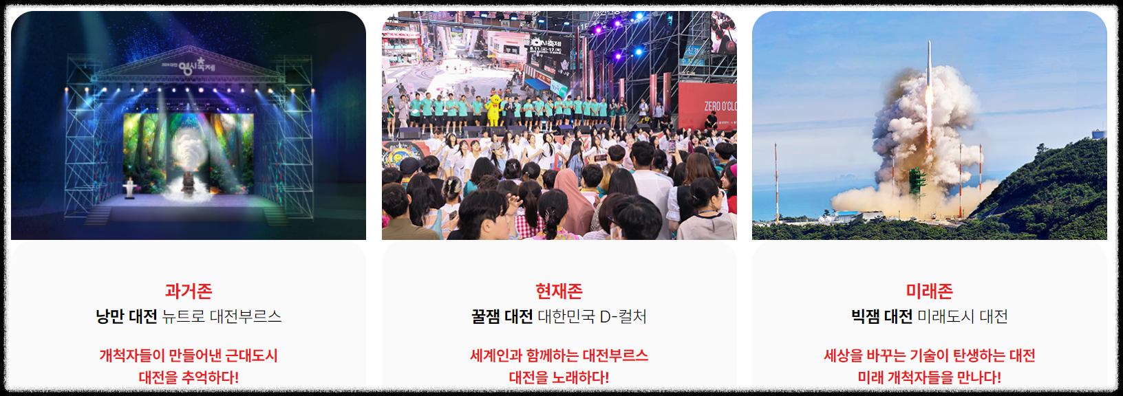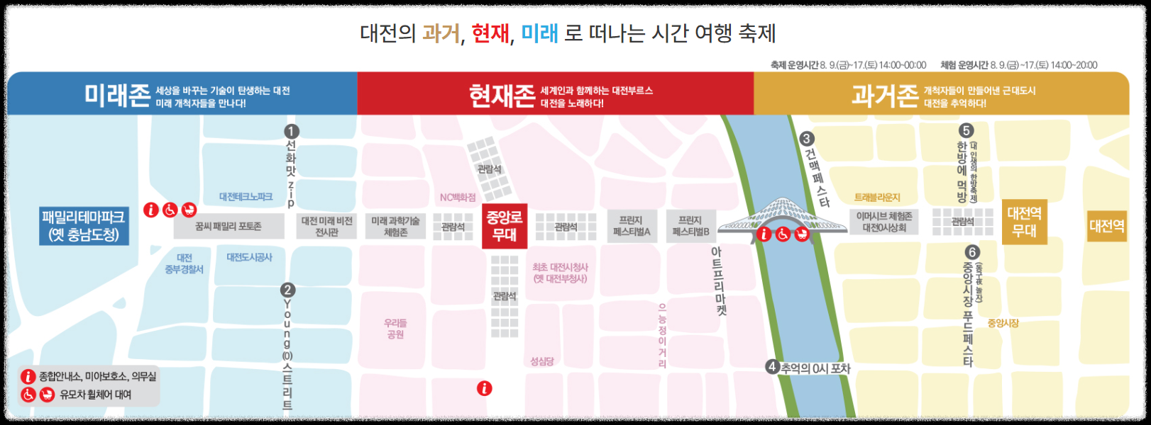 시간여행을 테마로 하여 대전의 과거,현재,미래존과 차 없는 거리로 나뉘어 운영됩니다.