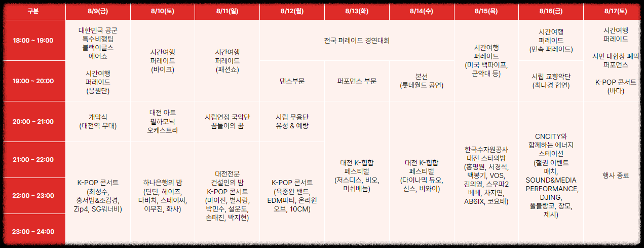 지금부터 대전 영시축제의 기본 정보와 출연진 라인업, 프로그램 내용을 정리해보겠습니다.