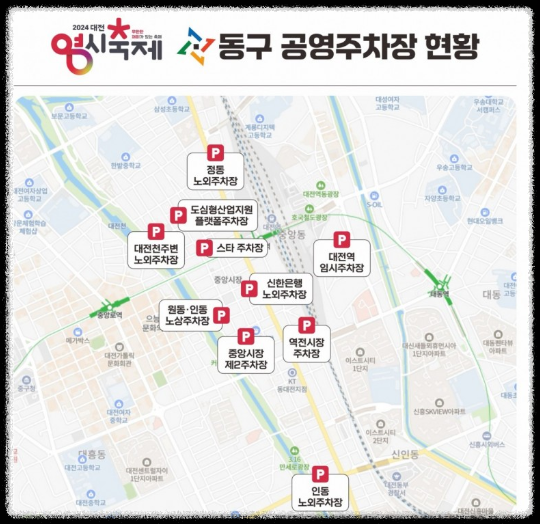 대전 영시축제기간내에는 대전에서 옛 충남도청까지의 중앙로 1km 구간을 차 없는 거리로 운영하니 참고하시기 바랍니다. 주차장은 대전역 주변 동구주차장과 충남도청 쪽 중구 주차장을 이용할 수 있습니다.