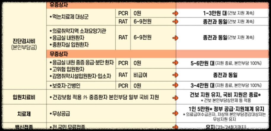 코로나 19 검사는 일반 의료체계로 완전히 전환되었기 때문에 보건소나 선별 진료소 운영은 종료되었으며, 병, 의원에서만 진료 및 검사가 가능합니다. 검사 비용은 유전자증폭(PCR) 검사는 평균 6만 원, 신속항원키트(RAT) 검사는 평균 3만 5천 원 수준입니다.