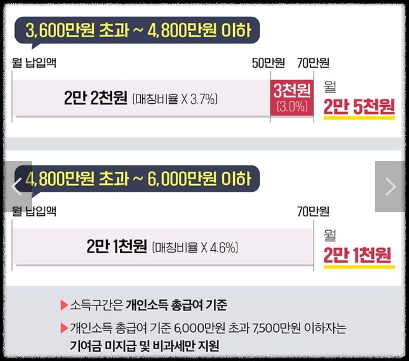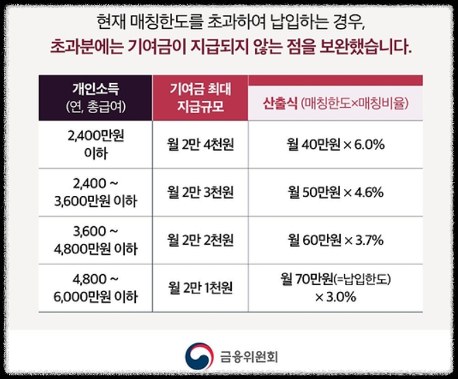 하지만, 정부 지원금은 매칭 한도가 있어서, 한도를 초과해서 납입하면 초과된 금액에 대해서는 지원금을 받을 수 없었어요. 이를 보완하기 위해 앞으로는 모든 소득 구간에서 매칭 한도가 없어집니다.