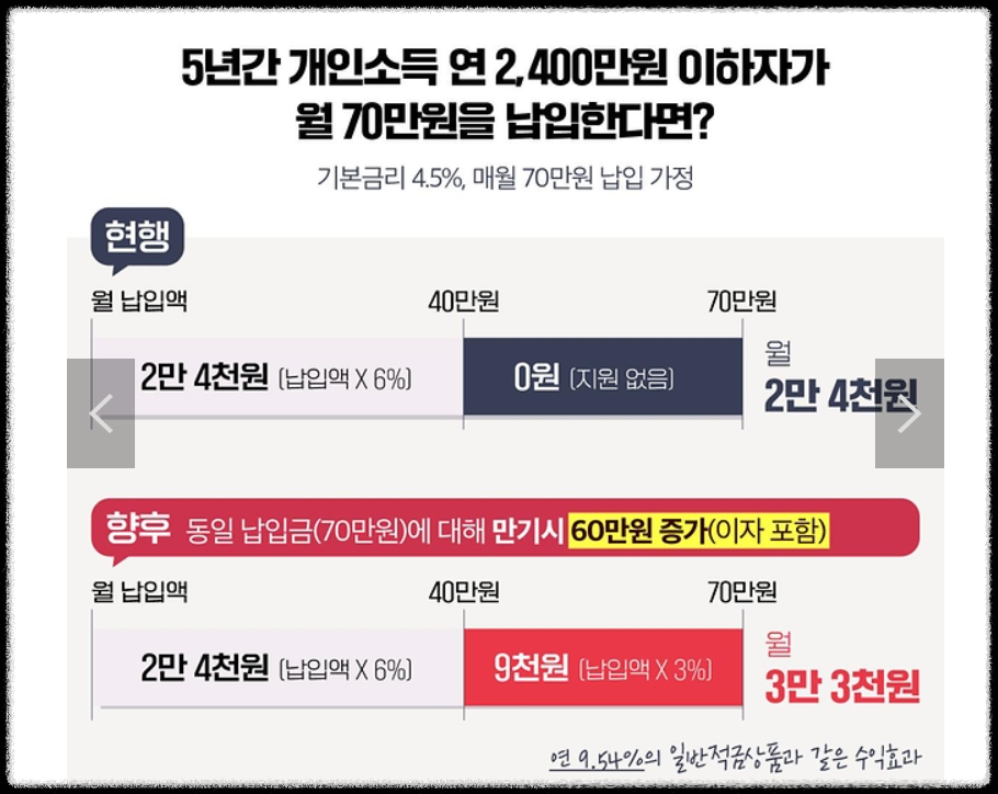 예시로, 소득이 연 2,400만 원 이하인 청년이 매달 70만 원씩 납입하면 기존에는 40만 원까지만 받던 정부지원금을, 앞으로는 초과하는 금액에 대해서도 3%의 비율로 정부기여금을 받게 됩니다.(매달 33,000원)