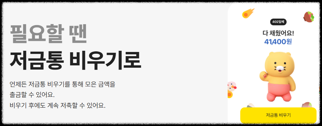 저금통 돈이 필요할 때는 간편하게 비워보세요. 해지를 고민할 필요는 없습니다. 카카오뱅크 저금통은 언제든지 비우기가 가능하도록 편리한 기능을 제공합니다.