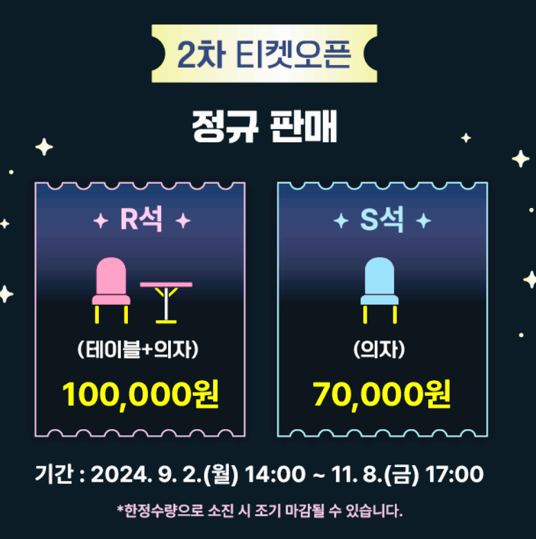 3. 티켓 가격 : S석(의자) 7만원, R석(테이블+의자) 10만 원