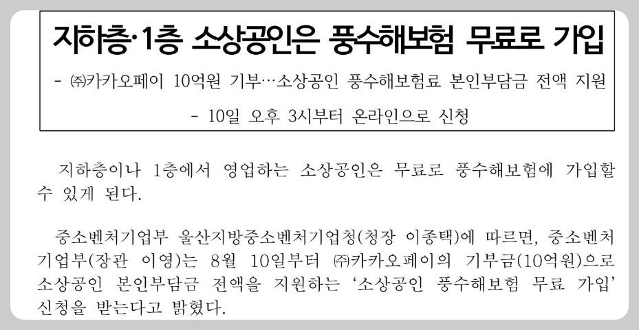 중소벤처기업부 (장관 이영)는 8월 10일부터 (주)카카오페이의 기부금(10억 원)으로 소상공인 본인부담금 전액을 지원하는 풍수해보험 가입 신청을 받는다고 밝혔습니다.