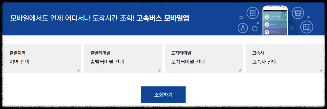 당일 출발 차량의 경우 출발 시간 1시간 전까지 홈페이지 예매가 가능하며, 1시간 미만 출발 임박 차량의 예매를 원하시면 고속버스 모바일 앱을 이용하시기 바랍니다.