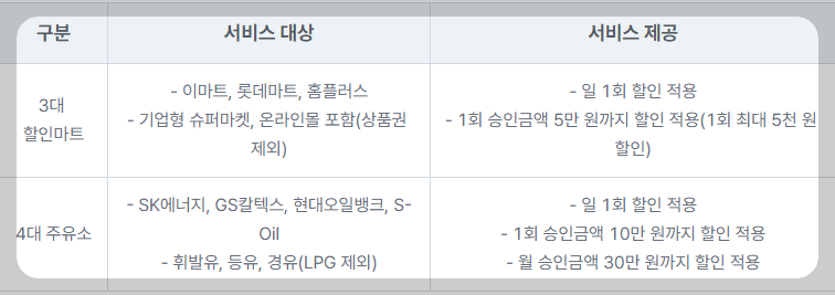 대형 할인 마트 3곳과 기업형 슈퍼마켓, 온라인 몰에서 10%씩 제공되며 4대 주유소에서도 리터당 60원의 할인을 받을 수 있습니다.