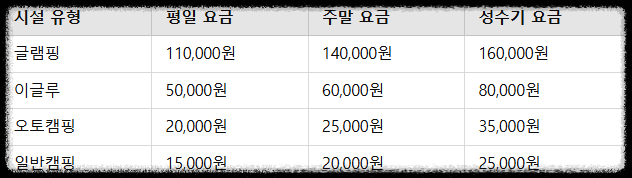 - 숙박 시설 (글램핑, 카라반, 이글루): 체크인 오후 2시, 체크아웃 오전 11시