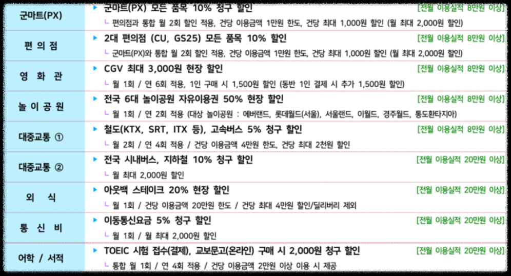 위 표를 잘 비교해 보시고 본인이 평소에 많이 이용하는 곳의 혜택 비중이 큰 카드를 선택하면 될 것입니다.