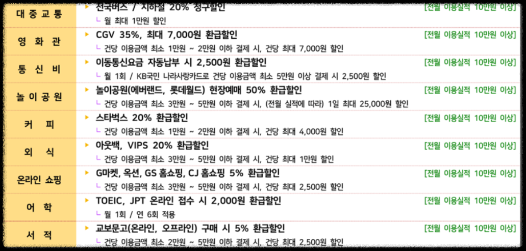 나라사랑카드의 가장 중요한 혜택 중 하나는 바로 대중교통 할인입니다. 국민은행 나라사랑카드의 교통비 최대 할인 한도는 20%로 꽤 많이 아낄 수 있는 포인트라고 생각합니다.