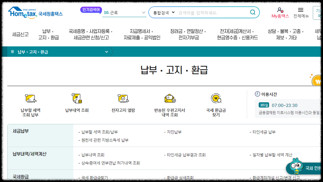 또는 국세청 홈택스에서 납부 ·고지· 환급 (좌측 상단)을 클릭 한 후 아래 국세 환급금 찾기를 클릭합니다.